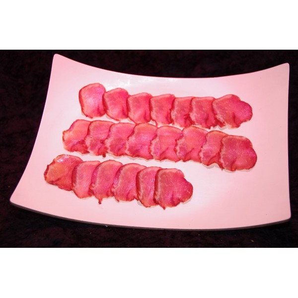 Caña de lomo ibérico 100% puro de bellota. lomo de máxima calidad, jugoso, sabroso y con un aroma único procedente de cerdos ibéricos alimentados a base de bellota. Loncheado y envasado al vacío en sobres individuales.