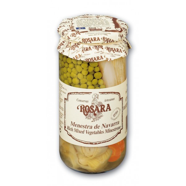 Exquisita menestra navarra elaborada con los mejores ingredientes de la huerta navarra, alcachofa, espárrago, guisante y zanahoria. Lista para ser servida.